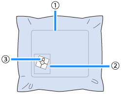Affix an embroidery positioning sticker to the fabric at the desired embroidering position. Align the center of the large circle in the embroidery positioning sticker with the center of the embroidery pattern.