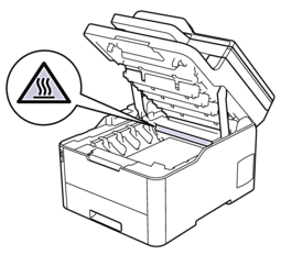 De interne onderdelen van de machine zijn ontzettend heet. Raak ze pas aan wanneer de machine afgekoeld is.