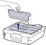 - Hold the handle of the toner cartridge and pull the toner cartridge up and out of the drum unit. Repeat this for all toner cartridges.